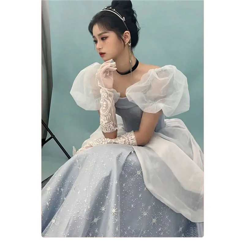 ↑Blue Princ Sle Evening Gown with Bubble Sves for Women Glowing Ball Dr Long Skirt ape for KTV Par PU Material - TopDealBox