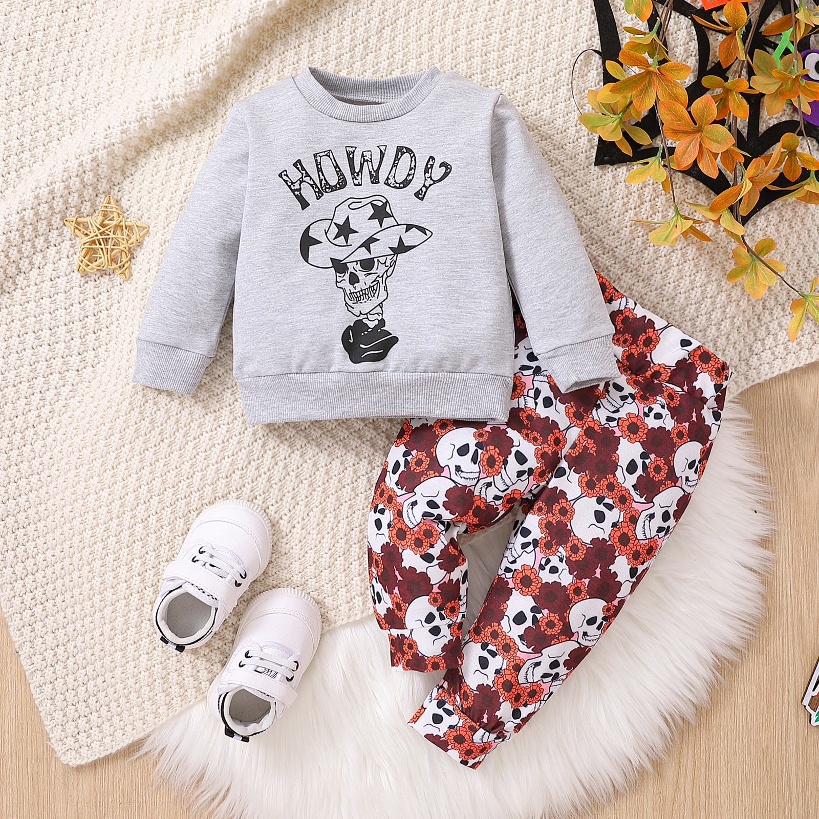 2pcs 2 Piece Set Newborn Baby Outfits Halloween O-Neck Long Sleeved Skull Letter ’Howday‘ Print Top+Flower Skull Print Pants