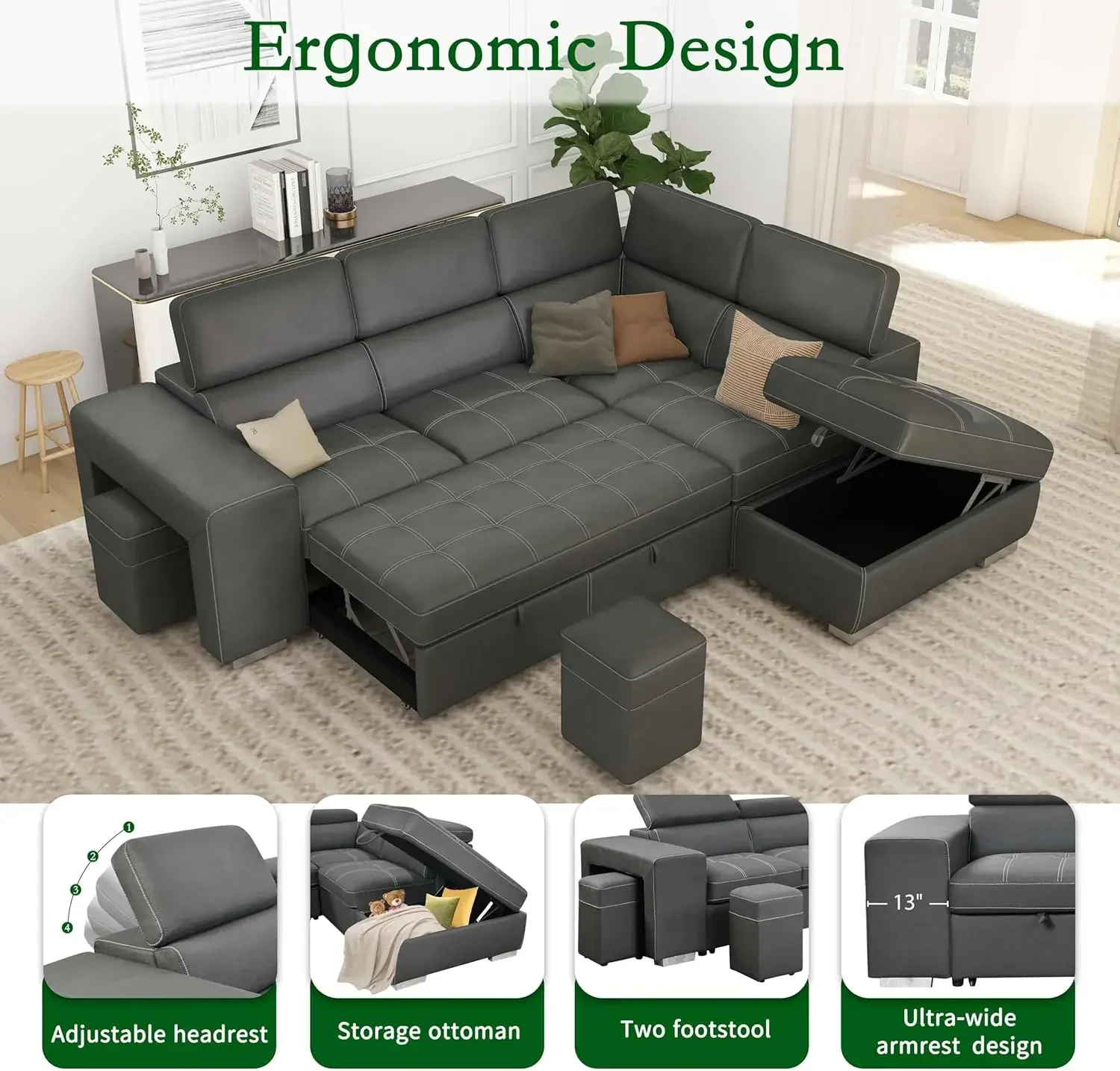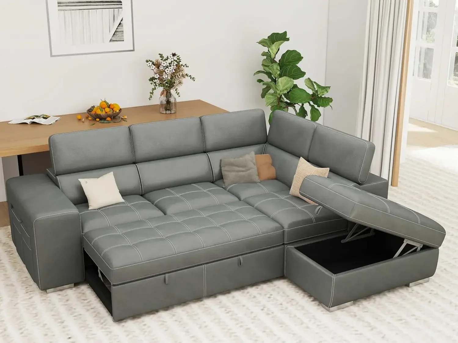 ↑104'' Microfiber L Shaped Sectional Sleeper Sofa Couch with Pull Out Bed and Storage Ottoman, Convertible Couches with - TopDealBox