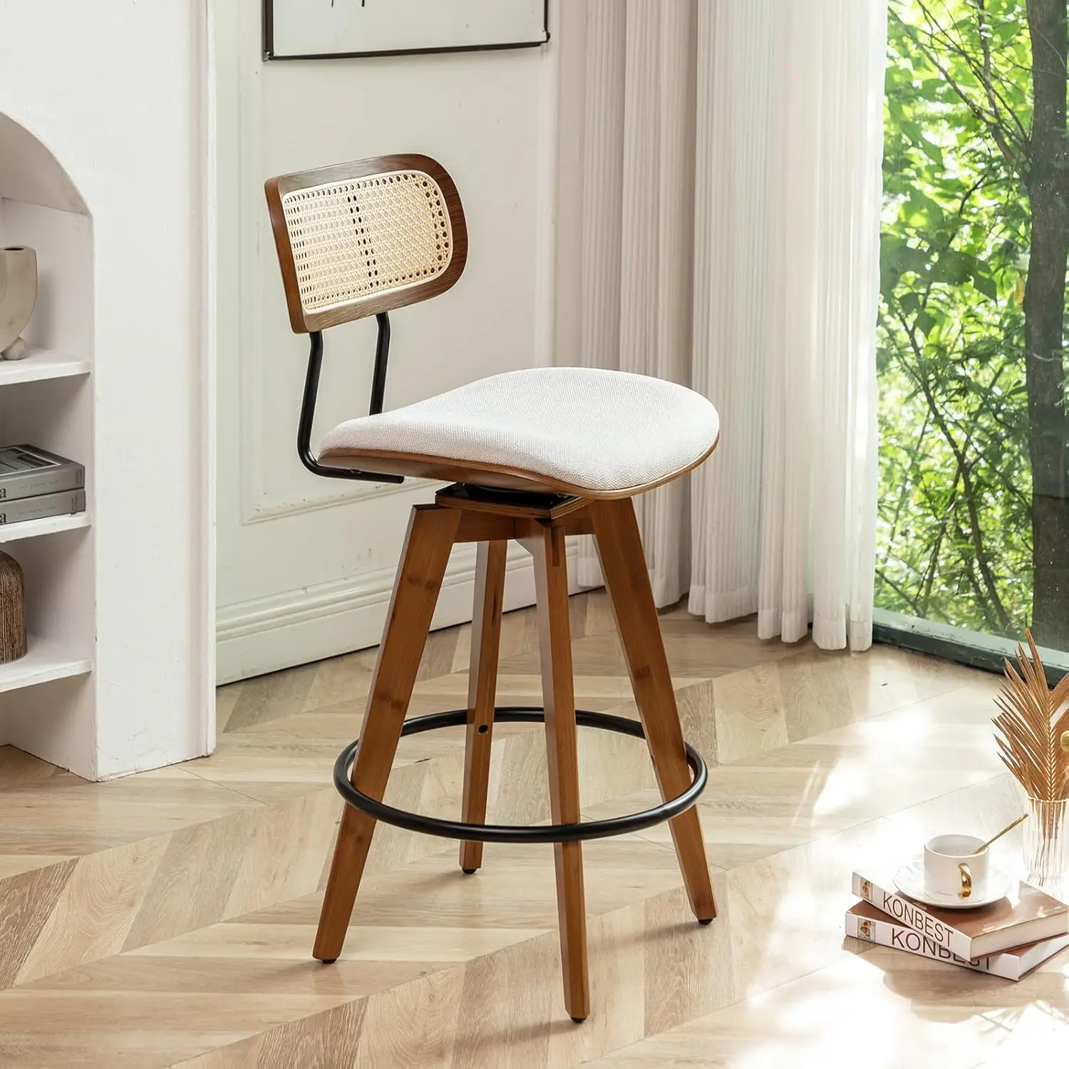 ↑26" Bar Stools Set Of 2, Linen Fabric Counter Height Swivel Barstools With Rattan Backrest And Wooden, Customized - TopDealBox