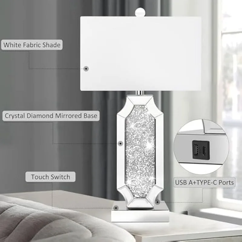 ↑3-Way Dimmable Touch Diamond Crushed Mirrored Bedside Table Lamps Set of 2 for Living Room with USB A+C Ports,Tall Silver Modern - TopDealBox