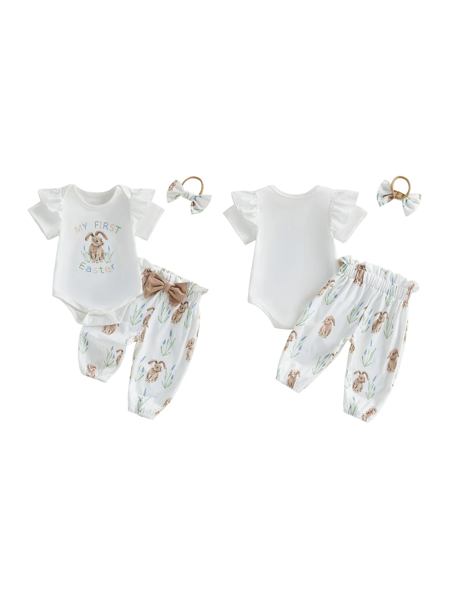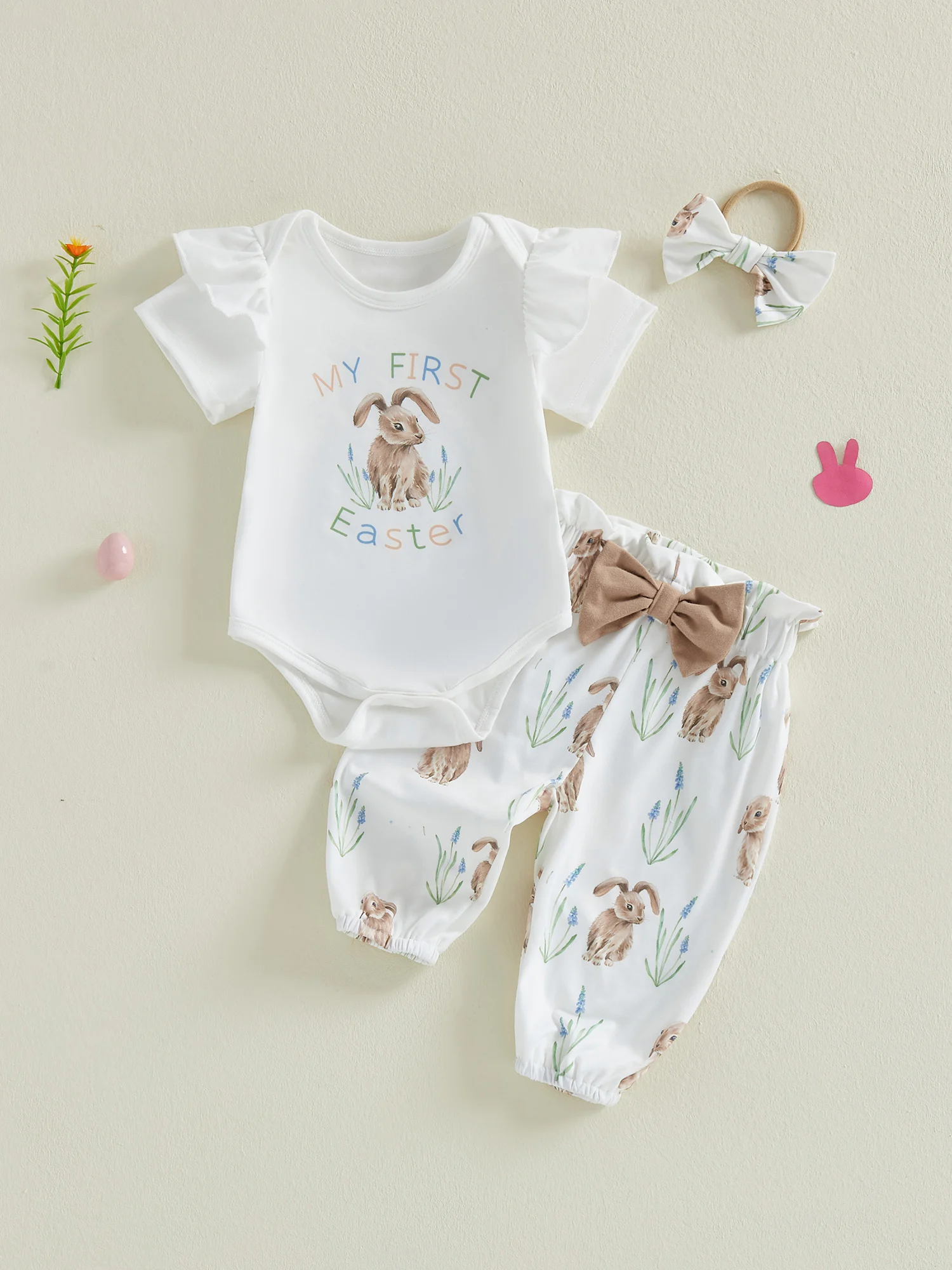 ↑Adorable Toddler Easter Clothes Bunny Patterned Short Sleeve Romper Pants and Headband 3 Piece Set for Baby Girls - TopDealBox
