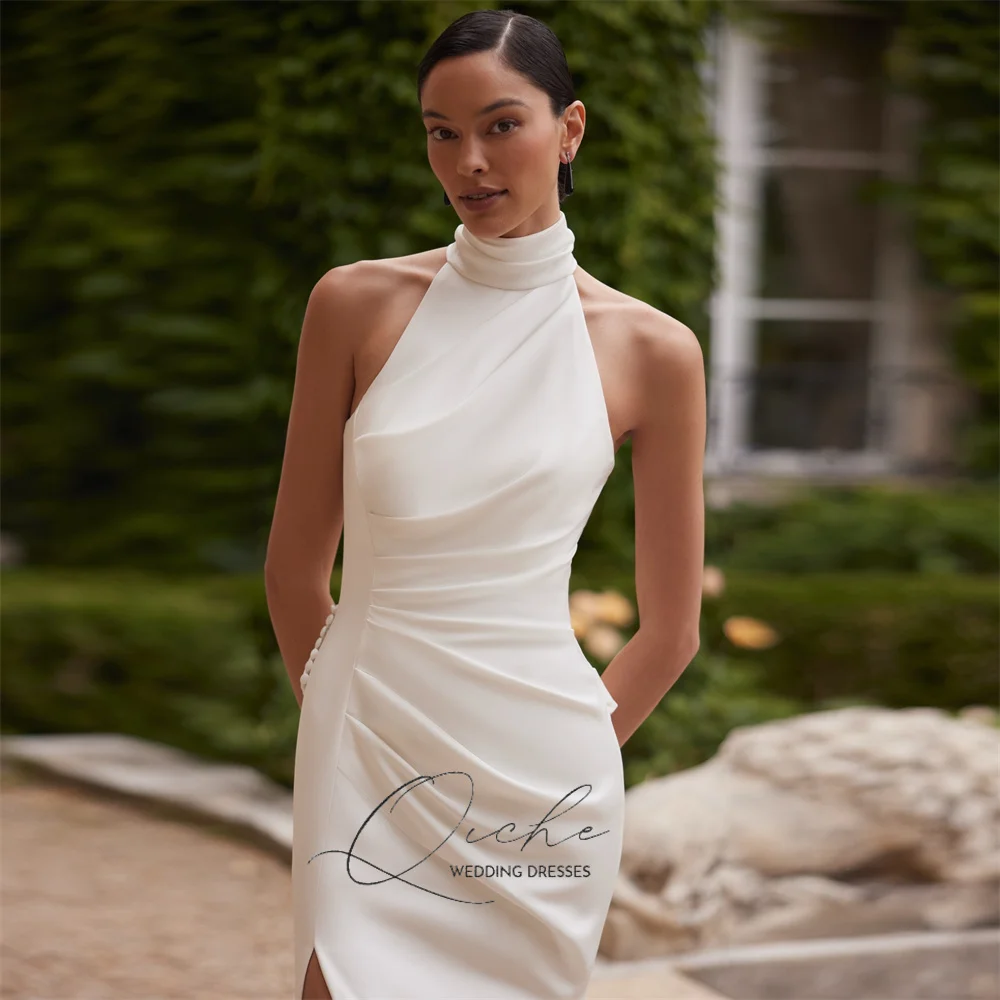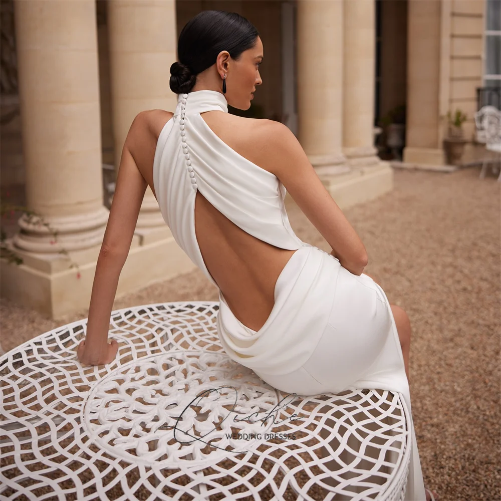 ↑QICHE Elegant High Collar Pleat Mermaid Wedding Dress Women Sleeveless Open Back High Side Split Buttons Bridal Gown Customized - TopDealBox