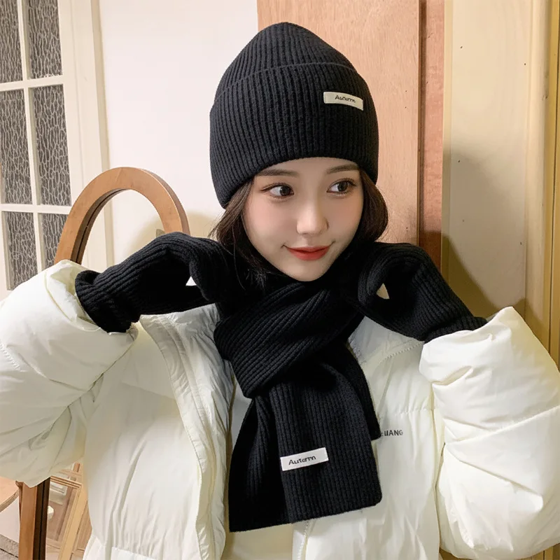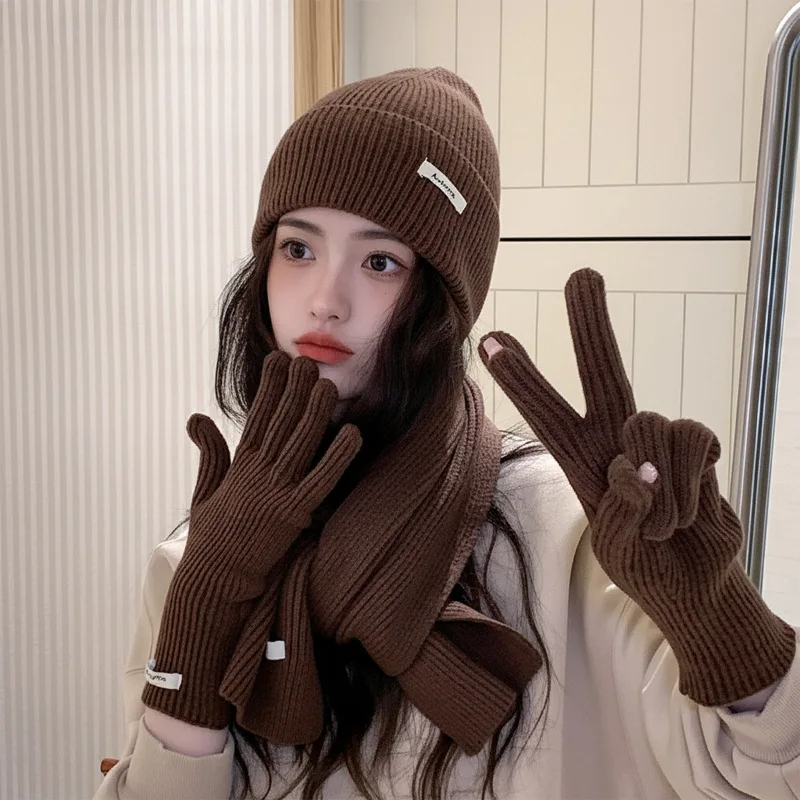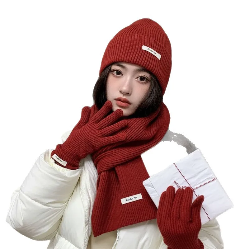 ↑Solid Color Knitted Wool Hat, Scarf, and Gloves Set - Autumn/Winter Fake Cashmere Red Warm New Year Christmas Set - TopDealBox